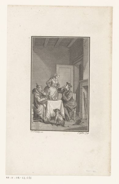 Curator: Johann Georg Wille's 1753 engraving, "Soldiers Talking to Market Women," held here at the Rijksmuseum, captures a fascinating intersection of military presence and everyday commerce. Editor: It feels immediate, doesn’t it? Despite the rather formal attire of the soldiers, there's something quite intimate about the exchange, almost as though we are eavesdropping. I'm drawn to the composition, how the figures are arranged and balanced to create depth and interest. Curator: Indeed. The image reflects the social realities of the time, showing the constant negotiation between those in power—the soldiers representing authority and potential disruption—and the women, representing the economic lifeblood of the community, bargaining. Editor: Semiotically, we can read the soldier's halberd not just as a weapon, but as a symbol of that power you speak of—the very real threat lurking beneath what appears to be a civil interaction. The dog adds a touch of naturalism and acts almost like a mediating point between the domestic and military sphere. Curator: Precisely. And it raises questions, doesn't it? Were the soldiers billeted in this town? What were the power dynamics at play between the occupying forces and the local populace? The women's gestures, their focused gaze, everything suggests an attempt to retain agency within an imbalanced context. Editor: Visually, Wille is drawing on that tradition of carefully constructed genre scenes, playing with light and shadow, creating interesting textures, yet he is imbuing it with these palpable social tensions that speak volumes about 18th-century society. Notice the precise lines in the figures clothing in contrast to the looser sketch style used for the building behind, providing focus on the conversation. Curator: Absolutely. This seemingly simple scene provides an enduring reminder of the complexities and nuanced negotiations required to maintain social cohesion amid shifting power dynamics. The fact that Wille, who witnessed similar military and political upheaval, was making these artworks only increases the intrigue. Editor: It is compelling how this artist was able to imply those historical tensions with line and form. The engraving invites us to actively read, as well as simply see, in our attempts to determine if there's tension or cooperation within the market square.