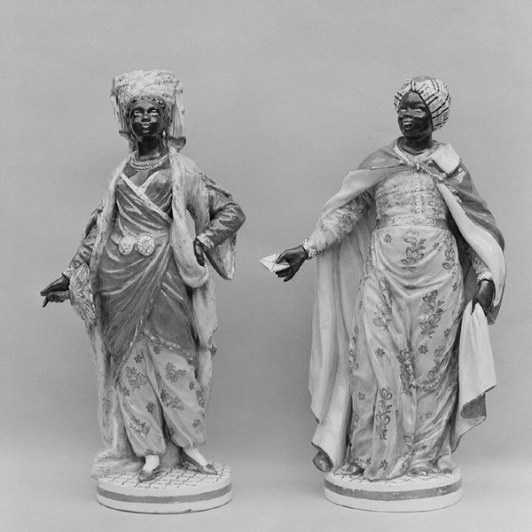 Curator: Just look at these porcelain figures! We have here one of a pair of Meissen figurines titled "Chinese Musician (Malabar)," dating from around 1760-1765. They're currently housed at the Metropolitan Museum of Art. Editor: They’re delightful! So elegant and poised, though there is something almost melancholy about the figures. Their eyes don't quite seem to meet yours. A dream-like performance of some exotic song. Curator: It’s important to remember the Rococo period's fascination with Chinoiserie. This wasn't necessarily about representing cultures accurately, but more about capturing the European imagination of the “Orient” as fanciful and decorative. Editor: Oh, absolutely! It’s like taking a beautiful dream and making it solid and purchasable. You can see it in the clothes they wear: elegant kimonos with fine floral patterns. This sort of porcelain seems designed to reflect the delicate fantasies of a wealthy European clientele. I think that the choice of material reinforces it. Porcelain, an "exotic" material by itself, embodies that quest for refinement and elegance. Curator: The medium is absolutely key here. Meissen was one of the first European producers of porcelain, a closely guarded secret. The choice to depict these "exotic" figures elevates the cultural significance. By taking this material that has become available only very recently to European markets, it shows they are no longer confined by geographic knowledge and social standards, so they portray that fascination of going beyond borders, either mental or social. The sculpture speaks to how that impacts arts, and reflects itself in fashion, art. Editor: The little bases made to resemble clouds make me think these performers float, they are lighter than air! More spirits than human beings. Do you think these works can promote acceptance, or do you feel these porcelain renderings were inherently appropriative, reflecting power dynamics between Europe and Asia? Curator: It's a complex question. While the figurines were born from an imaginative exoticism that lacked authenticity, they contributed to shaping how we understand and look at other cultures, for good or worse. This work offers us today the opportunity to reflect critically on representation. Editor: Exactly. Perhaps, after all, we're the ones interpreting it in our own "Rococo" way now.