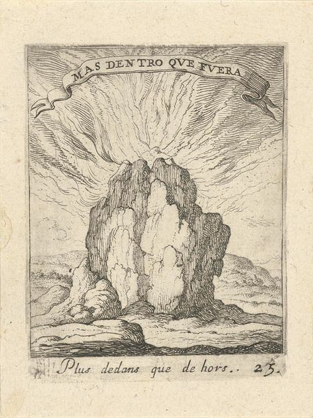 Editor: So, here we have Johann Sadeler's "Solar Eclipse at the Death of Christ," an engraving from sometime between 1580 and 1600. It's dominated by this rather imposing, almost angry, sun looming over a craggy landscape. It feels so dramatic and staged. How do we understand a piece like this in its time? Curator: Exactly, the drama! The piece speaks volumes about the socio-political function of religious imagery during the late 16th century. Think about it: the Counter-Reformation was in full swing. Art was enlisted as a powerful tool for reinforcing doctrine and evoking fervent emotional responses. The eclipse becomes less an astronomical event and more a signifier, a divine omen of monumental loss and change meant to inspire awe and submission in the viewer. Editor: Submission? That’s a strong word. It does feel almost theatrical, a deliberate manipulation of perspective and symbolism, but it’s a print. Who exactly was the audience, then, for such images? Curator: Precisely. Prints democratized art. These images, circulated widely, found their way into private homes, religious institutions, even books. Sadeler, as a master printmaker, understood this dissemination. He wasn’t just creating art, he was shaping public perception, framing the narrative around the crucifixion within a cosmic, undeniably God-ordained framework. The drama served a purpose: to instill belief and reinforce religious authority in a turbulent period. Editor: So, the landscape isn’t just a backdrop; it’s a stage set for a political and religious message? It’s amazing to see how deeply entwined art, religion and social power were at that time. Curator: Indeed. And reflecting on the role that art plays to create such narrative still holds relevance in modern artistic settings, doesn't it? Editor: Absolutely. Seeing how powerful imagery was back then really makes you think about the power it still holds today. Thanks for pointing all of that out.