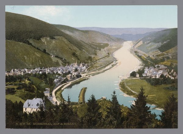 Editor: So this is "Gezicht op Bad Bertrich," a print, likely a photograph, from around 1889 to 1920, by an anonymous artist and held at the Rijksmuseum. It’s a view of a small town nestled in a valley. It feels very… nostalgic, almost dreamlike, and the printing technique gives it a kind of layered quality. What strikes you most about this piece? Curator: Well, given its likely origin as a mass-produced photograph meant for consumption by tourists, it presents an interesting challenge to traditional art hierarchies. The “artist” here, if we can even use that term, is more akin to a facilitator in a broader process of material production. What materials were available to the photographer and printer at that time? And what type of labor made it possible to create and circulate? Editor: I hadn't really considered it as something “mass-produced”. How does that change our perspective? Curator: Consider how the photograph becomes an object, a commodity almost. The picturesque scene, carefully framed, is meant to be consumed visually, but it’s also a tangible item for purchase. We must ask who benefited economically from these prints? And who had access to this representation of Bad Bertrich, shaping their perception of the region, versus those living and working there who made this all possible? Editor: So you're saying it's less about the artistic skill and more about the whole production line, from taking the photo to selling it as a memento? Curator: Exactly! Think about the social conditions. This era saw massive industrial expansion and rise of leisure activities. These photos catered to a burgeoning middle class with disposable income and a desire to document their travels, and reflect larger historical and economic forces at play. The appeal relies less on the artist’s vision and more on the ease of reproducibility, the consumption of scenery, and its accessibility as a purchasable souvenir. Editor: That really opens up a different way of seeing this piece. Instead of admiring the idyllic landscape, we're dissecting the system that allowed it to be captured and distributed. Thanks for your perspective, it makes me want to examine how labour and commodity shape art consumption.