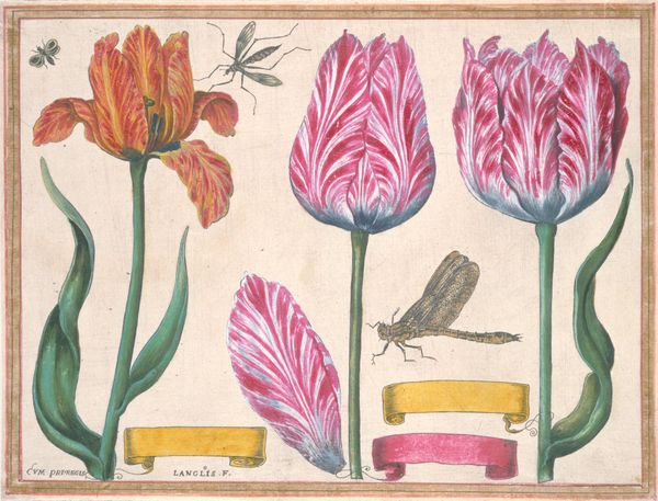 Curator: Isn't it lovely? This is "Iris Bulbosa Flore," made around 1620. It’s attributed to François Langlois and we believe it’s watercolor, possibly a print, on paper. It's such a perfectly captured natural scene. Editor: It's charming, yes. The detail, though – I keep noticing the insects tucked in between the blossoms and text. Is that a ladybug on the frame? Gives a different texture, almost makes the iris bulbs feel incidental. Curator: Ha, that's wonderful! "Incidental iris." I like that. I think it speaks to the curiosity of the era, this meticulous cataloging and documenting. Like a Renaissance scientist carefully arranging a specimen page. Editor: More than just a record, perhaps it was also about making things—using color to bring a flattened reality to life with precision. The print making allows for some social dimensions as a multiple original that may have moved amongst botanical circles, for instance. Curator: It’s as though, in trying to understand the object, they become one with it, rendering every delicate petal and tiny leaf with utter reverence. Almost like prayer. Do you feel that? Editor: Well, I think its composition pulls you in. It gives a glimpse into what materials are valued, doesn't it? Who would have consumed this and why? Those pigments must've been rare, right? That shade of blue... incredible. I wonder where they were sourced, who traded them. Curator: That brings it into our world even now, doesn’t it? This tension between a quiet, personal observation and its wider implication. Editor: Exactly! We begin to question what processes make it art and what making enables its circulation, whether amongst wealthy elites or other groups. Curator: What a gorgeous encounter. Editor: Precisely. A whole material world opened.