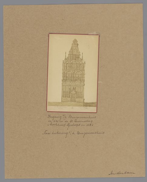 Albert Greiner made this photographic reproduction of a drawing of a house in Amsterdam sometime in the 19th century. The drawing is presented in a vertical format dominated by the symmetrical facade of the house. The near monochrome sepia tone creates a uniformity, allowing the intricate details of the building’s architecture to come forward. The structure is divided into distinct horizontal layers with each level featuring different window arrangements and decorative elements, creating a complex interplay of geometric forms. The building culminates in an ornate gable, typical of Amsterdam’s historical architecture. Consider how Greiner used the photographic medium to capture and preserve architectural forms. The drawing emphasizes structure and detail, almost as a formal study of the building’s facade. This representation invites us to reflect on how architectural drawings function as cultural and historical documents, encoding information about design. Architecture becomes a sign within the cultural landscape of Amsterdam. Observe the way Greiner captures the house; it functions both as a representation of a specific building and as an artifact of urban history.