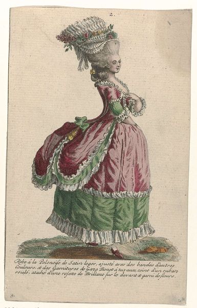Pierre Charles Baquoy created this print as part of the "Gallery of Fashion and French Costumes" in 1787. It captures a moment during the reign of Louis XVI, when fashion became a potent symbol of social identity and status. The print depicts a woman, referred to as "Petite Maîtresse du Palais Royal," showcasing an extravagant "Robe à la Musulmane." This was a style influenced by Ottoman and Middle Eastern fashion. The high hairstyle, elaborate lace, and rich fabrics signal the wearer's elevated social standing. However, the term "Petite Maîtresse" also hints at the woman's potential role as a king's mistress. This artwork invites us to consider the complex intersections of gender, class, and cultural appropriation in 18th-century France. While the woman embodies the height of French fashion, her attire reflects the contemporary fascination with exoticism and the appropriation of foreign cultures. It also points to the limited roles available to women, where status was often tied to their relationships with powerful men. The print serves as a poignant reminder of the social dynamics that shaped women's lives.