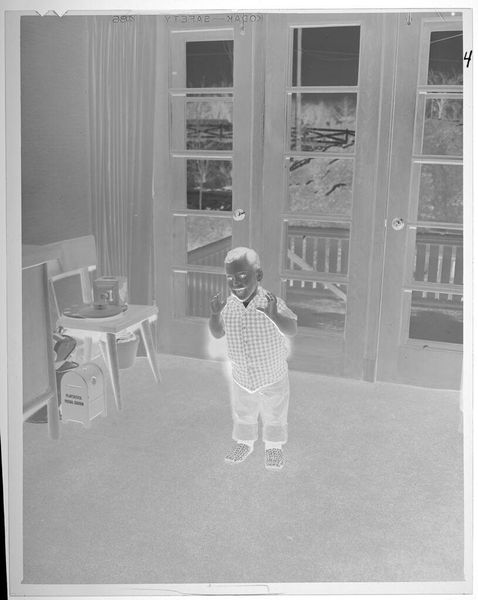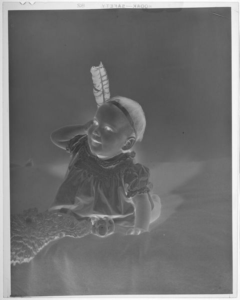 Editor: This photograph by Lucian and Mary Brown, titled "Untitled (boy wearing cowboy costume, with toy gun)," presents a small boy in full western regalia. The image seems inverted, ghostly. What story do you think it tells? Curator: It's more of a feeling than a story, isn't it? A memory, perhaps, faded and reversed. The toy gun… cowboys… it's childhood imagination filtered through the lens of time. Makes you wonder what games he was playing, and who he imagined himself to be. Do you see any darkness here, or just play? Editor: I see the play, definitely, but the inversion does give it an unsettling edge. I hadn't thought about it as memory before, but that really resonates. Curator: Exactly! Art often hides in plain sight, doesn't it? It’s these quiet, unexpected moments that linger.