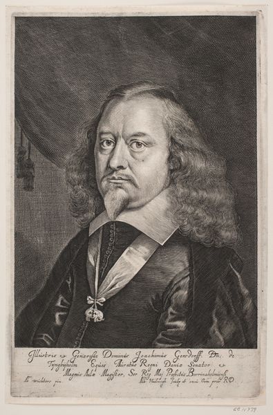This is Paulus Pontius's portrait of Antonius de Brun, etched in the 17th century, and part of the collection at the Rijksmuseum. The composition is dominated by a central oval frame, around which Latin text winds, encapsulating the somber but assured visage of de Brun. The visual elements and layout create a sense of formal dignity, typical of official portraiture of the period. Looking closely, Pontius’s technical skill is clear. The formal structure of the portrait, the composition, the fine lines, and the calculated use of light and shadow, reflect and reinforce the social status and intellectual gravitas of the sitter. There’s a clear intent to present de Brun not just as an individual, but as a figure of authority and consequence. Consider the careful detail of the coat of arms at the top. It serves not only as a symbol of lineage but also functions as a visual anchor, grounding the image within a specific socio-political context. The very structure of the portrait is thus enmeshed with codes of power. It invites analysis not only as art but as a carefully constructed message about identity and status.