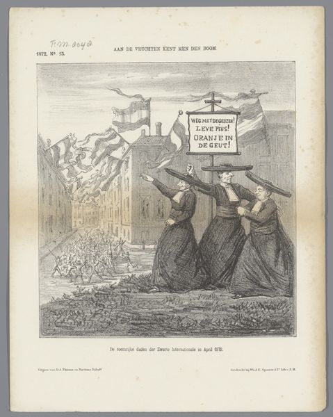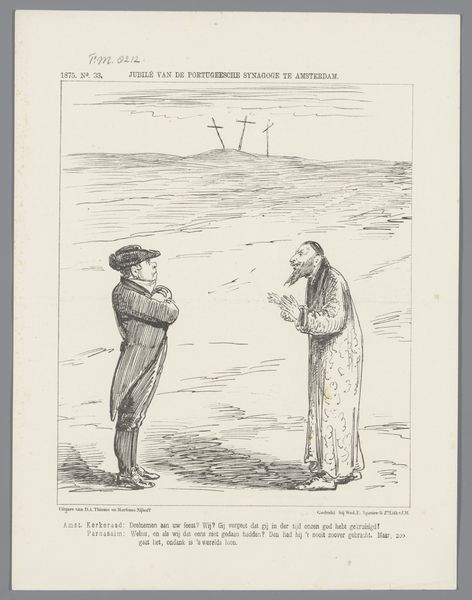 Johan Michaël Schmidt Crans created this print, titled "Spotprent," in 1878. The cartoon provides a window into the social and political landscape of the Netherlands at the time. The piece depicts two figures fishing in the Haarlemmermeer, with a "leeker" – a derogatory term for someone who drains water – submerged in the water. This imagery speaks to the ongoing tensions between the Dutch and the Spanish, evoking a history of conflict and struggle for independence. The figures are literally fishing for votes. This artwork employs humor to address serious issues of national identity and historical memory. The artist seems to suggest the old tensions still linger beneath the surface. The inscription reads, "Have you caught anything? Oh, I think I see an old Spaniard from the time of Alva." By intertwining political commentary with cultural references, Crans invites viewers to reflect on the complexities of Dutch society and its relationship to the past.