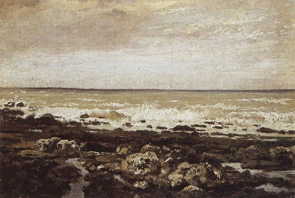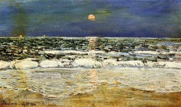 James Abbott McNeill Whistler created "Crepuscule in Opal Trouville" using oil paint on canvas, employing a technique that emphasizes thin layers of pigment. Whistler's approach to painting was influenced by the aesthetics of Japonism, with a focus on tonal harmony and subtle gradations of color. Here, the materiality of the paint itself is key. He thinned the oil paint to create a fluid consistency, allowing it to be brushed onto the canvas in translucent layers. This imbues the artwork with a sense of atmospheric depth. The subtle textures and variations in the paint surface contribute to the overall effect. Whistler's embrace of industrial pigments allowed for a broader range of colors and effects. These pigments, produced through mechanized processes, democratized access to artistic materials, yet also distanced the artist from traditional modes of craftsmanship. This painting reflects a shift in artistic practice toward a greater emphasis on individual expression, rather than adherence to established artistic norms. Ultimately, "Crepuscule in Opal Trouville" challenges the traditional boundaries of fine art by embracing both industrial materials and an emphasis on the artist's subjective experience.