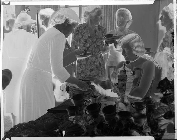 This photograph, "Untitled (women with aprons at bazaar)" by Robert Burian captures a moment of community and commerce. Here we see a group of women gathered at what seems to be a local bazaar. While the image is visually inverted, this adds an interesting layer to our interpretation. The women, dressed in their aprons, stand behind tables laden with goods. These garments, signifiers of domesticity and labor, become statements of female agency. Considering the absence of explicit information about the subjects, this photograph speaks to the everyday experiences of women in the workforce, where their contributions often go unrecognized. The bazaar setting underscores the intersection of gender, class, and economic opportunity. The photograph offers a glimpse into a world where women negotiate their identities through both domestic roles and participation in community economies. It invites us to reflect on the historical context of women's work and the power of collective action.
