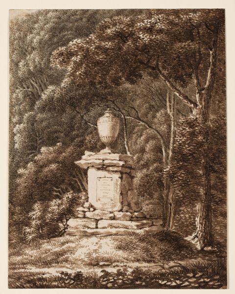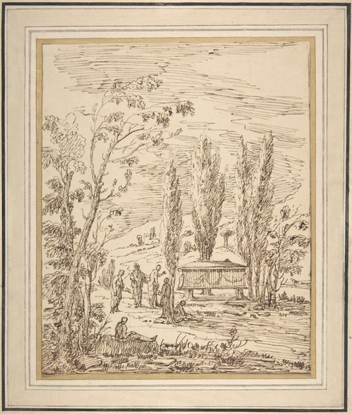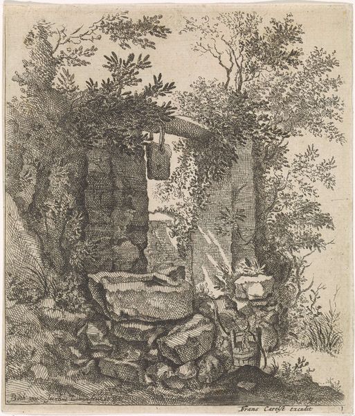 Curator: Today we are observing Albert Meyering’s etching, "Landskab med figurer, der gør holdt ved et gravmonument," placing it somewhere between 1645 and 1714. A Baroque landscape scene rendered through delicate lines. Editor: It certainly evokes a melancholic air, doesn’t it? The fine lines create a rather ethereal landscape with those figures resting at what seems to be a gravesite. Curator: Precisely. Notice the stark contrast between the monument’s rigid geometry and the soft, almost weeping, lines forming the foliage. Semiotically, the verticality of the structure draws the viewer's eye upward while the figures remain firmly grounded. It presents a dichotomy, a spatial tension between aspiration and earthly constraints. Editor: And I wonder, given the production limitations of printmaking at the time, what kind of tools and methods might have been used to render the detail on such a small scale? Think of the labor involved to create these miniscule details. We might consider this etching as more craft than art, and the value judgements associated with each. Curator: That's an insightful proposition, to regard its artisanal construction, though I see it through the Baroque's lens: Meyering wields the graphic line with incredible sophistication to produce layered meanings. Take for instance, the interplay of light and shadow produced by the etching. He masterfully orchestrates tone through the varying density of lines, leading us through the emotional complexity of the scene. Editor: I appreciate the Baroque style here. And I imagine this kind of artwork was consumed, shared, sold and appreciated across social classes, not limited to a narrow upper class. Etchings had a function within a particular context of cultural exchange and distribution, which the choice of medium, print, implies. Curator: A crucial element of appreciation. The distribution indeed broadens the landscape tradition beyond elite circles, and speaks to its accessibility to the public, further heightening the piece's thematic resonance. Editor: Well, thinking through its construction certainly casts a different light on what seems a straightforward historical etching. Curator: Indeed. These formal aspects and your emphasis on its material processes really highlights that interaction between intention, labor, and form is exactly how an artwork can be elevated.