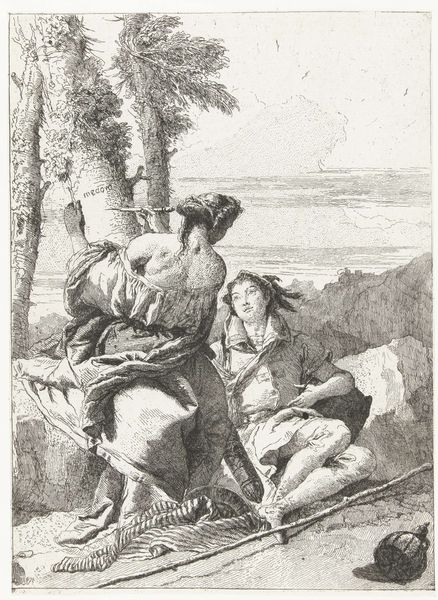 Giovanni Domenico Tiepolo etched "Angelica geneest de wond van Medoro" sometime in the 18th century. Here, we witness a scene steeped in chivalric romance, where Angelica tends to the wounded Medoro. The image resonates with motifs familiar across epochs. The caring gesture of Angelica echoes the age-old symbol of the Madonna tending to Christ, a visual language deeply embedded in our cultural memory. This act of healing transcends mere physical aid; it touches upon themes of compassion and redemption. Consider the 'compassionate woman' motif—it resurfaces in diverse cultural contexts, from ancient goddesses of healing to the present day. It represents a collective human desire to nurture, protect, and heal, suggesting a universal psychological imperative to connect with and care for one another. The intensity of Angelica's gaze carries an emotional charge, a subtle but powerful force engaging viewers on a subconscious level. This is no mere illustration but an echo through time.