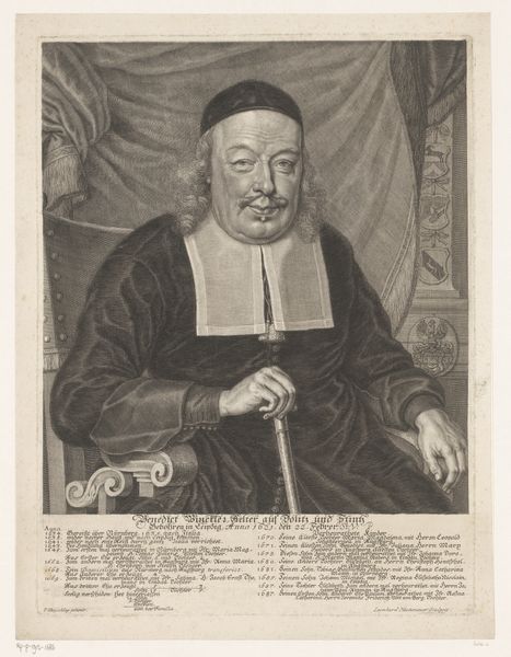 Editor: So, this is “Portret van Johannes Koch von Gailenbach,” made between 1693 and 1736 by Andreas Matthäus Wolfgang. It’s an engraving, a kind of print. The gentleman looks quite…stately. Almost imposing. What strikes you when you look at it? Curator: I think this image offers a fascinating window into the performance of status and authority in the Baroque period. Consider how the elaborate framing device—the wreath, the inscriptions, even the coat of arms—functions to legitimize von Gailenbach’s position within the social hierarchy. Editor: So it’s not just a portrait of an individual? Curator: Absolutely not. It’s a statement about power, lineage, and intellectual standing. Notice how the Latin inscriptions contribute to an aura of erudition and classical virtue. What impact do you think these choices have on our understanding of the subject? Editor: It feels like he’s trying to construct a very specific image of himself for posterity. Curator: Precisely. And this brings up important questions about representation, identity, and the role of art in reinforcing dominant ideologies. How much of what we see is a true reflection of von Gailenbach versus a carefully constructed persona? Editor: That’s fascinating. I hadn't really considered all the layers of meaning embedded within the portrait. Curator: That’s the power of engaging with art through a critical lens. It allows us to deconstruct the narratives presented to us and uncover the complex social and political dynamics at play. Editor: Thank you. This was so helpful.