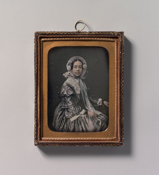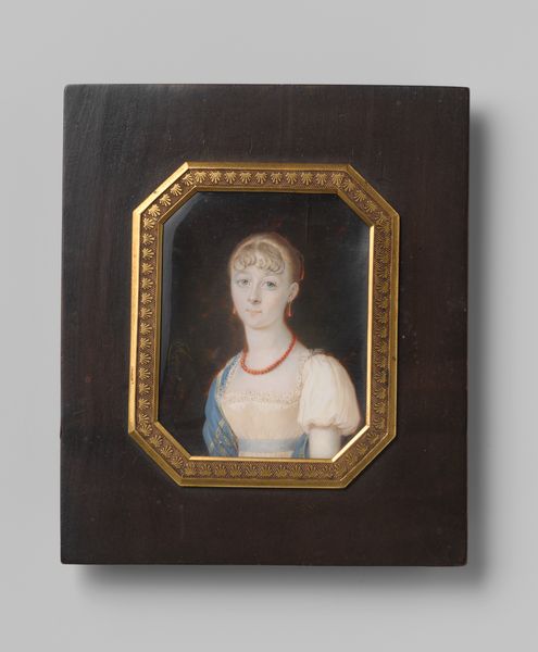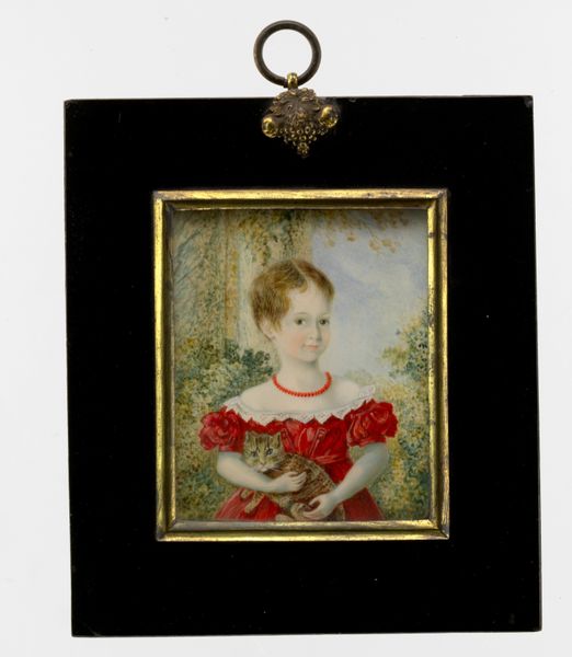 Editor: This is Margaret Bogardus’ miniature painting, "Paul Joseph Revere," created between 1837 and 1843. I find the whole composition really interesting. It feels intimate but also strangely formal. What stands out to you? Curator: What captures me is how the image is miniaturized, almost a locket’s size, yet the boy’s presence feels monumental. Think about that in relation to memory. How does shrinking an image amplify its emotional weight? The circular hoop he holds…it isn’t just a child’s toy. Consider it a halo, a symbol of wholeness, framing youth’s potential. What sort of message does that send? Editor: That's a unique point about the hoop and how size relates to memory and significance. I hadn’t considered that at all. So the artist might be imbuing him with a symbolic importance that goes beyond just being a portrait of a young boy? Curator: Precisely! And look beyond the main figure. In the background, two figures play near the wall. A child and... perhaps a governess or older sibling? That enclosure isn't just architecture. It suggests boundaries, stages of growth. It prompts us to think, where is *this* boy in his development? He is both held, but straining, by this hoop, for further stages. This imagery resonates with historical anxieties surrounding childhood. Editor: So, by playing with scale, symbolism, and background imagery, Bogardus created a complex statement about identity, memory, and maybe even social status in this piece? Curator: Indeed! It serves as a reminder of how portraits can function as powerful carriers of cultural memory. Editor: This has totally changed how I view portraiture, and now I’m really keen to delve deeper into the symbolic language of painting. Curator: Then my work here is done. Remember: art holds more than beauty; it encapsulates the cultural narratives of its era.