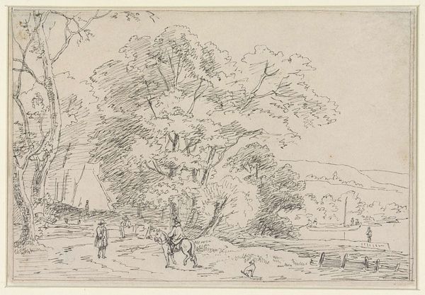Editor: So, this is "Garden with Staircase with Statues," a pen and ink drawing by Dionys van Nijmegen, estimated between 1715 and 1798. There’s something wonderfully ephemeral about it, like a dream half-remembered. It's like Nijmegen dashed this off to capture a fleeting mood, right? What catches your eye when you look at this, what’s speaking to you? Curator: Ephemeral is a perfect word! For me, it whispers of grand Baroque gardens slowly surrendering to nature’s chaotic embrace. Notice the architectural elements, like that hint of a staircase, and the suggestions of statuary swallowed by the wilderness. There's a tension between control and abandon that tickles my fancy. What do *you* make of the lone figure in the distance? Editor: Good point! It’s hard to ignore that little person standing near a sculpture, who is easy to miss but feels monumental to the whole experience. But in such a huge garden, with so many strokes everywhere, how should we imagine them in this situation? Curator: Ah, the Big Questions! Perhaps Nijmegen is playing with scale, dwarfing humanity against the backdrop of a garden reclaiming itself. Or maybe he’s offering a quiet meditation on our fleeting presence within the larger tapestry of time and nature, maybe both? It invites you to make up your own mind! Which makes me ask, do you feel a connection between the lone figure and us, the viewers? Editor: It's funny you should ask! For me, the fact that this scene remains only partially sketched invites me to think what's beyond that staircase. It’s kind of exciting, I would say. Curator: Precisely! And that's the beauty of drawings like these, isn't it? They're not definitive statements, but rather open-ended invitations for the viewer to collaborate and dream. A true testament to the power of suggestion. Editor: Well, it certainly gave me a new way to consider what drawings, like gardens, really do, which is to spark an idea. Thanks!