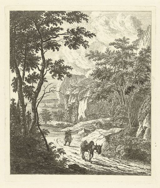 Editor: This is Jurriaan Andriessen’s "Landschap met vee," dating from 1752-1819, and created with watercolor. It’s a calming scene. The layers in the painting almost make the piece feel staged, each one with varying color palettes and details. What do you see in this work? Curator: Structurally, the piece exhibits a fascinating manipulation of depth through color. Note the gradient from the vibrant greens and browns in the foreground to the muted blues and greys of the distant mountains. This not only creates spatial recession but also segmentizes the composition. Consider also the dominant verticality established by the trees, balanced against the horizontal sweep of the landscape. Do you observe how the light delineates the volumes? Editor: Yes, it’s clear in how it bounces off the leaves and defines the shapes of the cows in the lower register. It’s as though each plane has its own individual light source. Curator: Precisely! The artist consciously constructs the composition through contrasts of light and shadow. The meticulous rendering of the trees’ branching structures acts as a filigree, drawing our eye into the pictorial space. Note the subtle semiotic play: cows grazing peacefully against the backdrop of a fortified building on the distant hill. Does this contrast trigger further inquiry into the narrative framework? Editor: It does! The pastoral imagery combined with hints of societal structures is compelling. I suppose I didn't initially see past the beauty of the natural forms and how they are captured so well. Curator: A very keen insight. Close analysis unveils layers beyond immediate appeal, transforming our comprehension of its construction. Editor: Indeed, the dialogue between form and representation seems much more deliberate now, revealing new ways to think about watercolor and landscape art.