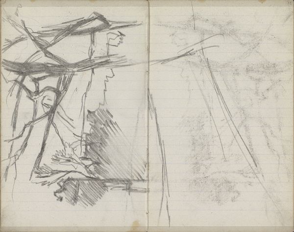 Editor: This drawing, "Gezicht op het Rokin met de Langebrug" by George Hendrik Breitner, dates from around 1898-1902. It's a pencil sketch on paper, and you can see the lines of the sketchbook page underneath. I find it kind of mysterious – it feels incomplete, almost like a glimpse of a memory. What do you see in this piece? Curator: What strikes me is how Breitner captures a rapidly changing urban environment. Amsterdam at the turn of the century was undergoing significant social and economic shifts. This sketch isn’t just a depiction of a cityscape; it's a fragment of a lived reality marked by industrialization and modernization. The Langebrug was a place of encounter, of exchange, a place where different social classes and identities may have crossed paths. What stories do you imagine the people crossing this bridge could tell? Editor: That’s interesting! I hadn’t considered it that way. I was just seeing it as a quick, maybe even careless sketch. Curator: "Careless" is an interesting choice of words. Could it be argued that its sketch-like quality makes it particularly insightful? This sketch feels intimate because we are seeing his thought process, not just a finished idea. And maybe, too, this unfinished quality can act as a metaphor for social mobility and the idea of progress in a period of rapid social change. Do you think the fragmented quality contributes to that? Editor: I suppose so. It's less about the details and more about the overall impression, and how these fleeting moments contributed to social narratives. I never thought about art in terms of sociology like this. Curator: Art doesn't exist in a vacuum. By understanding its historical and social contexts, we see the artwork, not simply as a beautiful object, but as a point of intersection. We can think of it in dialogue with a diversity of fields like urban planning, sociology, or philosophy. Editor: This really broadens my perspective. Now I see it as more than just a simple sketch, but as a mirror reflecting social changes. Curator: Exactly!