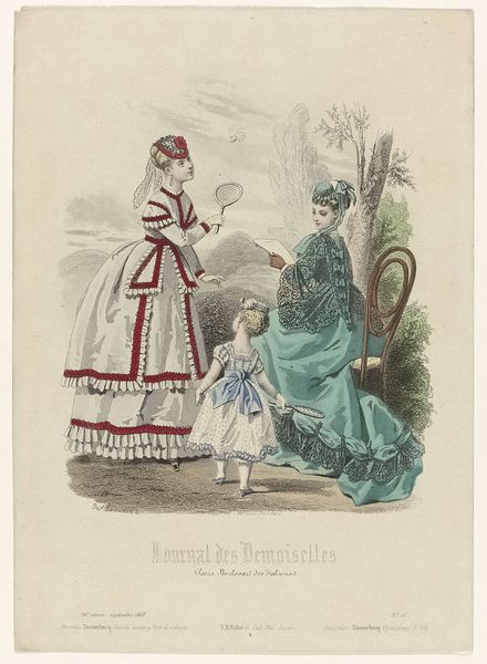 Louis Berlier made this print around 1860 in France, showcasing the height of Parisian fashion. This wasn't just about pretty dresses; it was about power, class, and the booming textile industry of Lyon. The image creates meaning through visual codes, cultural references, and historical associations. The extravagant gowns, complete with frills and ribbons, signal wealth and leisure. The women are positioned in a manicured garden, a space of privilege and display. Consider Lyon's silk industry at this time, a major economic force. Publications like 'La Mode Illustrée,' where this image appeared, fueled consumer desire and shaped social aspirations. We can delve deeper by exploring fashion plates from the period, examining textile manufacturing records, and studying the rise of department stores. By understanding these factors, we see how art reflects and reinforces the social structures of its time, even in something as seemingly frivolous as fashion.