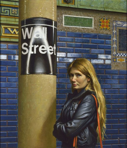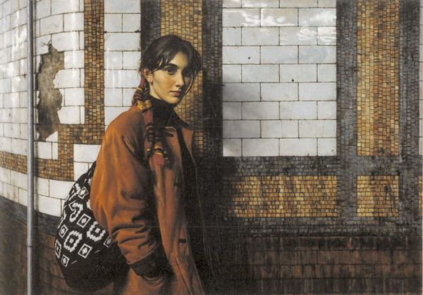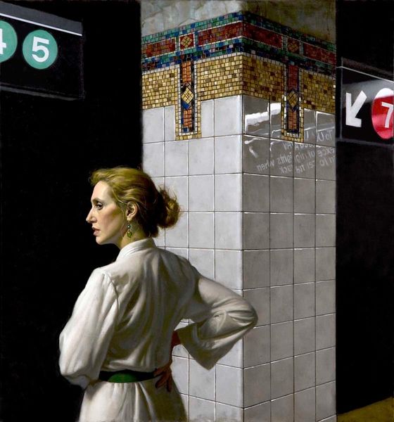 Daniel Greene painted 'Waiting for the Train – Sophie' using oil on board. Greene applies thin layers of oil paint, resulting in smooth surfaces and soft gradations of color. His choice to depict a young woman in a mundane setting invites us to consider the relationship between labor, class, and everyday life. The amount of work and material needed to create this painting raises questions about who has the time and resources to engage with art, either as a creator or consumer. The painting invites contemplation on the time we spend waiting, traveling, working, and consuming within these spaces of transit. Greene's skilled brushwork, combined with the painting's subject matter, blurs the boundaries between fine art and craft. This work prompts us to consider the social and cultural significance embedded in both the materials and the making of art.