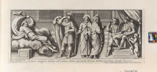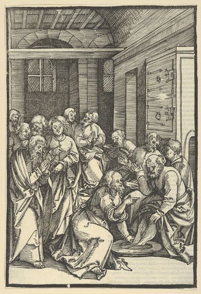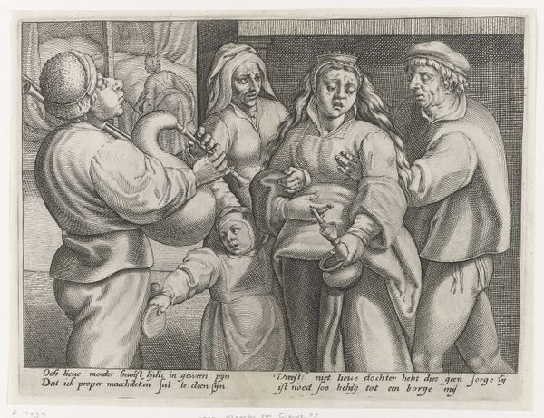 Adriaen Huybrechts created this print, Drinkend gezelschap met een nar, using engraving. The composition is striking, a bustling scene unfolding within a confined space. Huybrechts masterfully utilizes the stark contrast between light and shadow to direct our gaze across the tableau. The figures are arranged in a dynamic, almost chaotic manner, drawing us into their revelry. The diagonal lines of the jester's raised arm, contrasted with the curves of the embracing figures, create a sense of movement and energy. The artist has constructed a semiotic system through the characters' gestures and expressions. The embrace between the figures, the jester's commanding gesture, and the focused activity of the women, create a narrative structure that hints at themes of social interaction and hierarchy. Ultimately, this print challenges static notions of meaning. Instead, it functions as a dynamic interplay of form and content that invites ongoing interpretation and reflection.