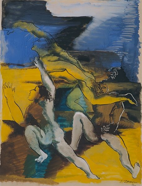 Zoe Lerman created this textured painting called "Dialogue" with oil. The canvas, awash in muted yellows, immediately draws you into a space where figures emerge from a semi-abstract ground. The figures in "Dialogue" lean into each other, forming a dynamic composition. The artist uses line and form to convey a sense of movement and connection, but also of distance. Observe how Lerman employs a limited palette to create visual interest, and how the loose brushstrokes contribute to the painting’s overall mood. The artist destabilizes traditional form through fragmented shapes. The ambiguous forms could be read as a critique of fixed identities. This open-endedness invites ongoing interpretations, challenging viewers to actively engage with the work's potential meanings.