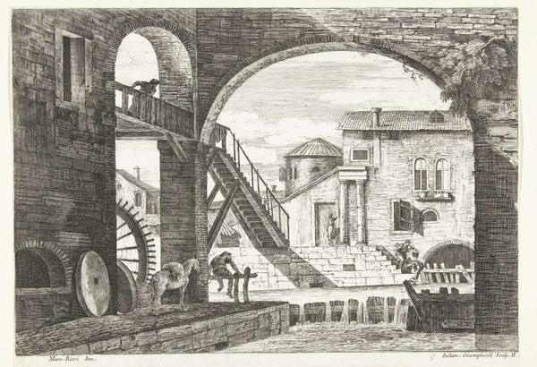 Editor: Here we have Giuliano Giampiccoli's "Huis met toren aan water," created around 1739 or 1740. It’s an engraving and, honestly, it feels very industrious. The detail is incredible; you can practically hear the sounds of the workers and the water. What aspects stand out to you? Curator: I'm immediately drawn to the tangible aspects of its production. Look at the lines – consider the sheer labor invested in creating such intricate details through engraving. The materials used – the paper, the ink, the metal plate – all point to a specific mode of artistic production tied to its time. How might the act of printing multiple copies impact the art world, allowing for a wider consumption and accessibility of imagery beyond unique paintings? Editor: That's fascinating! I hadn't thought about the mass production aspect. So, it’s not just about the image itself, but about how that image was made and distributed? Curator: Precisely. We must look at who had access to such prints, the workshops that employed artisans, and the societal function it served. Was it purely decorative? Did it function as a record of specific architecture, impacting the way people saw and interacted with their surroundings? What sort of labor did it require? Editor: It feels like there’s almost a romanticization of labor, though maybe that's my 21st-century perspective creeping in. Curator: Maybe, or maybe Giampiccoli is documenting and celebrating the physical exertion inherent in daily existence. Either way, he reminds us about those who toiled in Venetian commerce. What do you suppose a print like this might cost back then? Was art for everyone, or just the elite? Editor: It completely changes how I see this piece. It’s no longer just a pretty cityscape, but a document reflecting social structures. Curator: Exactly! By looking at the materials, the making, and the context of its creation, we unravel a much richer understanding. It invites us to look beyond aesthetics, asking bigger questions about value and the world it reflected.