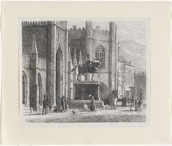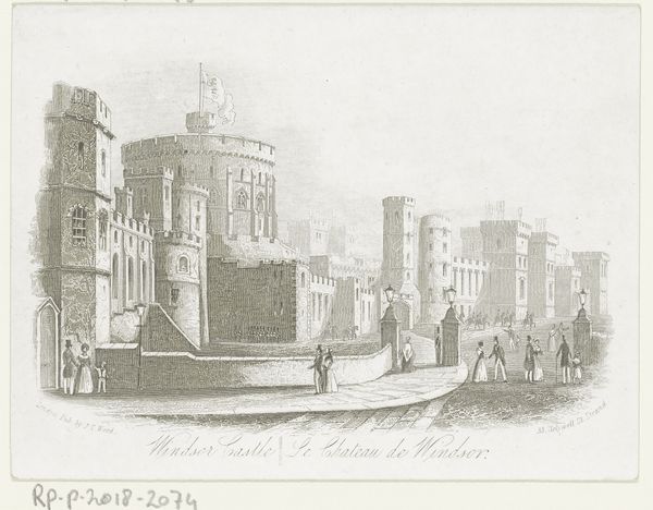 Curator: I find myself immediately drawn into the graphic intricacy of this engraving—the precision of the lines, creating such a powerful illusion of depth. Editor: Indeed. This piece, titled "Gezicht op Windsor Castle," produced sometime in the 19th century, presents Windsor Castle not simply as a monument, but as an active stage for the performance of power, class, and identity within a specific historical moment. Curator: Note how the varying densities of the cross-hatching give the stone its weight and texture, truly rendering it in three dimensions. The eye is led on a complex journey of the facades! Editor: Yes, and if we zoom out, we also note how it is an interesting study in national identity as portrayed and consumed in popular culture. Windsor, as a symbol of British authority, plays a very interesting role, even in what appears to be an anonymous hand rendering the Castle in "retro vintage" design style. Curator: The atmospheric perspective created through subtle gradations of tone give a certain sublime, pictorial effect despite its apparent lack of detail. The composition uses a classic, almost academic perspective, lending the entire image an aura of stability and enduring authority. Editor: But who experiences that authority? Those promenading in the foreground surely partake in the aura. Consider the legacy and continued social stratification reinforced by these types of representations in art, in archive photography! Curator: That is a valuable point, highlighting the dual role the artwork plays, both as a demonstration of skill and a silent endorsement of an established social order. I am compelled to note its effective use of chiaroscuro, something we don't often associate with simple sketches. Editor: I agree that analyzing how it functions technically enriches the viewing. However, seeing past formal concerns can offer insight into more current dialogues centered around representation. Curator: So true! The composition and shading elicit discussion around representation but, beyond that, one gains new awareness of the political impact historical artistic trends continue to reflect. Editor: I walk away understanding more how the piece can operate not simply as an illustration, but also as an interesting historical record in the study of power and perception.