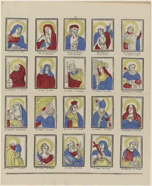 Franciscus Antonius Beersmans created this print titled "Heiligen". The work presents a collection of sixteen distinct, uniformly framed portraits arranged in a grid. Each portrait depicts a religious figure, identified by inscriptions beneath their images. Beersmans employs a restricted color palette, primarily using green, red, and yellow to delineate each figure and their respective symbolic accoutrements. A structural analysis reveals the repetition of oval-shaped halos and the consistent ornamental frames, which serve to unify the diverse representations of the saints. The visual organization suggests an underlying semiotic system, where each color and object functions as a signifier. The interplay between these signs invites us to explore the values and categories inherent in religious iconography, challenging fixed interpretations.