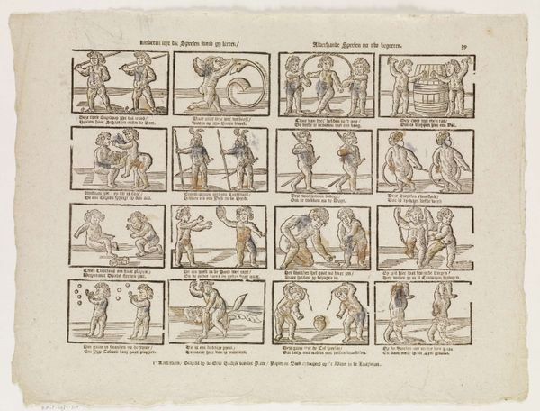 This print, made by weduwe Hendrik van der Putte, is an example of early printmaking, likely from the 18th century. It uses etching or engraving, techniques that allow for the mass production of images on paper. The print shows four scenes framed as if on a stage, each depicting different follies or vices. The labor involved in creating such a print is considerable, requiring skill in both design and the physical act of carving the image into a metal plate. This process reflects a society increasingly geared towards production and consumption. The visual style and the satirical content are typical of popular prints of the time, meant to be widely disseminated and understood. The choice of printing as a medium, rather than painting or sculpture, suggests an intention to reach a broad audience, potentially influencing public opinion and reflecting social norms through accessible imagery. It’s a reminder that what an artwork is made of, and how it is made, is as crucial to its meaning as what it represents.