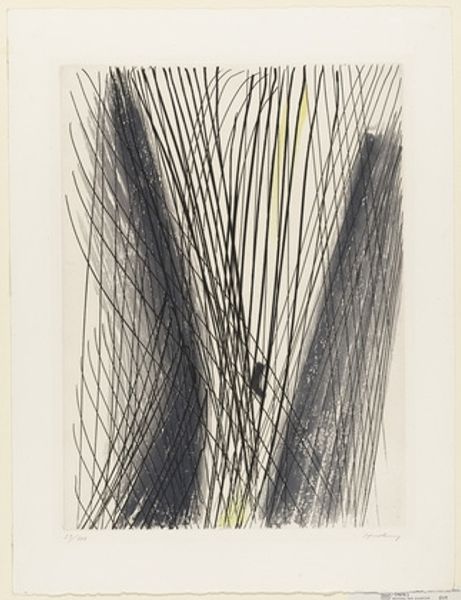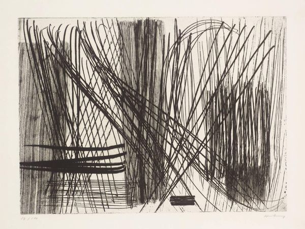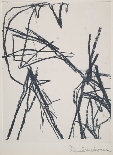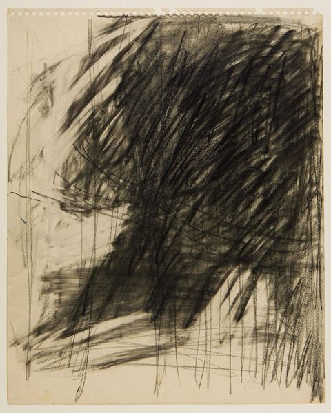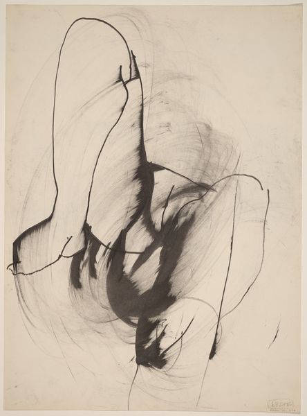 Curator: Arthur Miller's "Textures; contrasts in value," at the Harvard Art Museums, presents a striking study in monochrome. The piece measures about 20 by 25 centimeters. Editor: It feels very immediate. The heavy strokes create such a palpable sense of movement, almost like wind whipping through dry reeds. Curator: Absolutely. I read the swirling lines as a reflection of inner turmoil, perhaps a visual metaphor for societal unrest. Miller’s bold strokes seem to reject traditional artistic norms, embodying a raw, unfiltered expression. Editor: The application of ink, the pressure used to create these dark, sweeping marks, and even the absorbency of the paper, these details speak to the artist's physical engagement with the medium. Curator: True. And that physicality underscores the socio-political context. Miller's abstraction becomes a defiant act, challenging oppressive structures through its very form. Editor: Looking closer at these layered, textured lines, I see an image built from raw materials, literally. Curator: A powerful reminder that art, and resistance, can emerge from the simplest means. Editor: Yes, it's the artist's physical struggle with the materials that brings the image to life.