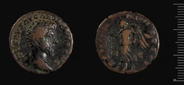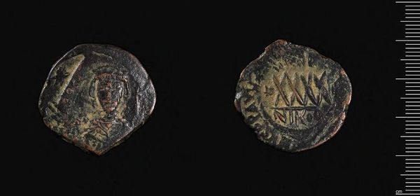 Editor: Here we have a coin of Justinian I, held at the Harvard Art Museums. It’s fascinating to consider the iconography packed onto such a small object! What do you make of the imagery here? Curator: The symbols are key. The image of Justinian with his crown and the cross invoke divine authority. It is a visual representation of power, linking the emperor to both earthly rule and spiritual legitimacy. Editor: So, these symbols are reinforcing Justinian's role as emperor? Curator: Precisely. Consider how the image and inscription together act as a form of propaganda, embedding the concept of Justinian's divinely sanctioned rule into the cultural memory of the Byzantine world. Editor: I see. It's amazing how much a single coin can tell us about a ruler's ambitions. Curator: Indeed. A coin is not just currency; it’s a concentrated message, intended to shape perceptions and perpetuate power.