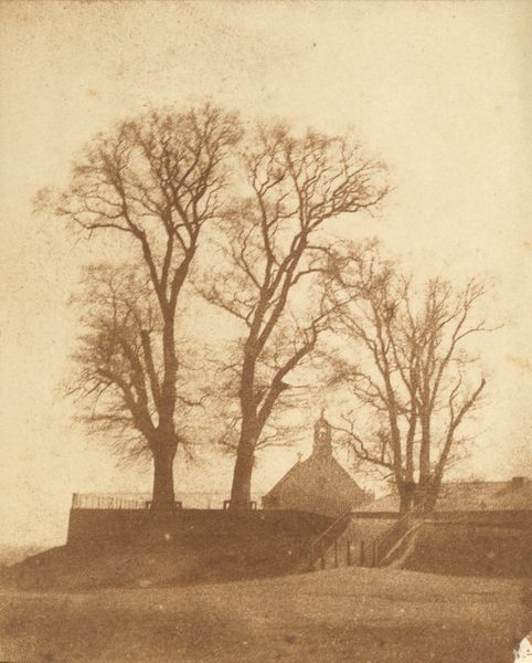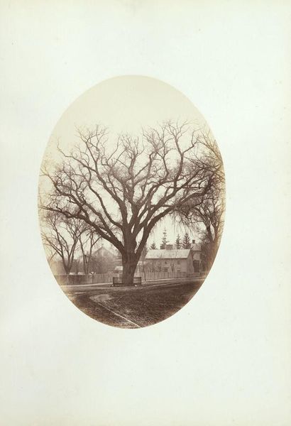 Curator: This is George Kendall Warren's photograph, "Washington Elm, Cambridge, Massachusetts," currently held at the Harvard Art Museums. Editor: It evokes a stark, almost melancholic feeling with that grand, bare tree dominating the landscape. Curator: The elm itself became a potent symbol. Legend held that George Washington took command of the Continental Army beneath its branches in 1775. Editor: An invented tradition, of course, but the tree became a powerful focus for early American identity. The image presents a fabricated memory as an authentic historical artifact. Curator: Precisely. This photographic postcard helped disseminate the image and the mythology of the Washington Elm widely. It’s interesting how we create meaning through constructed images. Editor: Absolutely. And photographs, like this one, become physical embodiments of those shared, sometimes invented, narratives. This postcard reminds me about the power of myth-making. Curator: A great example of the intersection of nature, myth, and the public imagination, captured in a small photograph.