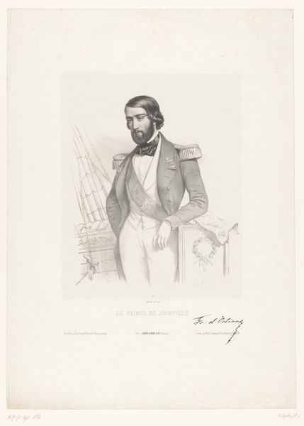 Editor: This is "Portret van Abdülmecit I, sultan van het Ottomaanse Rijk," or "Portrait of Abdülmecit I, Sultan of the Ottoman Empire" by Carel Christiaan Antony Last, dating sometime between 1842 and 1887. It’s a drawing, a pencil print actually. The detail is impressive, and yet there's a kind of restrained elegance to it. How do you interpret this work? Curator: Consider first the composition. The figure is centrally placed, filling much of the frame. Note the artist’s meticulous use of line. See how the hatching defines form, creating volume and texture. Look closely at the gradients: the soft rendering of the face contrasts with the more defined costume details. Editor: So you're focusing on how the lines and shading create form, almost like a sculptural relief on paper? Curator: Precisely. Now, regard the figure’s pose. The subtle gesture of the hand holding what appears to be part of a sword hilt suggests a controlled power. The costume, the fez, the medal – each element functions as a signifier of status. Editor: Yes, the costume really jumps out! What about the effect of it all? It is very detailed but subtle! Curator: Consider how that subtlety draws us in, demanding a closer look to decipher its visual language. We see a careful articulation of power through form and detail, not bombast but a quiet assertion of authority. The lines themselves portray that strength! Editor: It's interesting how you highlight the details, those intricate visual elements all contributing to this controlled, powerful presence. Thanks, that really changes my perspective! Curator: Indeed. The artist's command of line and composition creates not just a portrait but an ideogram of imperial power. This offers great insight into the creative direction of the work, I think.