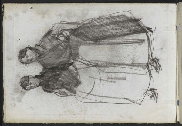 Isaac Israels created this drawing, now at the Rijksmuseum, using a few simple strokes to capture a standing woman and feline figures. The overall visual experience is one of spontaneity, with the artist focusing on the basic forms rather than intricate details. The structure of this drawing reveals Israels' engagement with capturing movement and essence. The lines are quick and gestural, almost as if he's trying to freeze a fleeting moment. This approach aligns with a broader artistic trend of the time, which valued capturing the immediate impression over meticulous realism. The use of line, rather than shading or detailed texture, emphasizes a semiotic system where each stroke is a signifier. This drawing doesn't merely represent a woman and cats; it communicates a sense of dynamic energy. It invites viewers to fill in the gaps, to co-create meaning by piecing together the fragmented visual information. Israels challenges fixed meanings, exploring how much can be conveyed with so little.