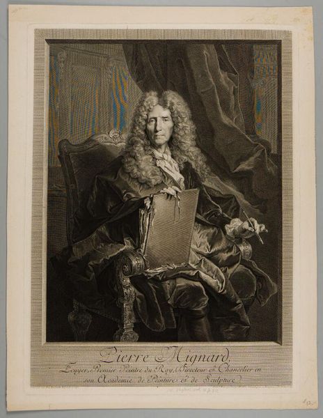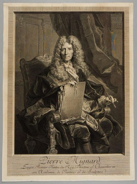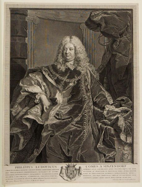 Curator: This is Pierre Drevet’s engraving of Samuel Bernard, a financier during the reign of Louis XIV. The print, now held at the Harvard Art Museums, captures Bernard in a moment of poised authority. Editor: The most striking thing is the sheer abundance! The billowing wig, the elaborate drapery, it speaks to a culture of conspicuous consumption. Curator: Indeed. Bernard's wealth was intricately tied to the political and military ambitions of the French monarchy. His identity as a financier, therefore, intersects significantly with the broader narrative of French expansionism. Editor: The ships in the background…it all feels like a stage for masculine power and privilege, constructed on the backs of others. What’s the power dynamic at play, and who benefits? Curator: Precisely! This portrait, then, becomes a complex cultural artifact. It presents a challenge, urging us to critically examine its underlying social and economic narratives. Editor: Looking at this today, I can't help but wonder how much has really changed in terms of wealth and power dynamics.