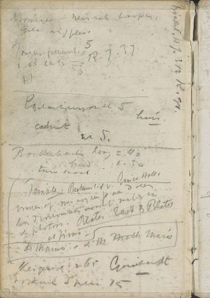 Editor: Here we have "Studie, mogelijk een architectuurstudie," or "Study, possibly an architectural study," created between 1886 and 1923 by George Hendrik Breitner. It’s ink and pencil on paper, held at the Rijksmuseum. It feels incredibly ephemeral, almost like a fleeting thought captured on a page. What strikes you most about its composition? Curator: The power here lies in its starkness. We see line, form, and their relationships as the primary actors. Note the artist's choice to deny us the full illusion of depth, flattening the architectural forms through suggestive linework rather than perspectival accuracy. The value then, lies in how Breitner manipulates the very qualities of line—its weight, its density, its direction—to communicate an impression of spatial complexity. Editor: So, the appeal is less about what is represented and more about *how* it's represented? Curator: Precisely. Consider the economy of line. There are no superfluous marks; each seems deliberately placed to contribute to the overall structure. We also can appreciate the contrasting effects achieved with such simple means. Editor: It makes you appreciate the technical skill. I was so focused on it feeling like a quick sketch. Curator: But the "quickness" is deliberate. What would the experience be like if the architectutal plans were precise? The raw marks add immediacy and draw us to their elemental power. Editor: I never considered how intentional it all was! I'm definitely looking at it differently now. Curator: The beauty resides in its calculated execution. I am glad we could engage with the form, line, and technique of "Studie."