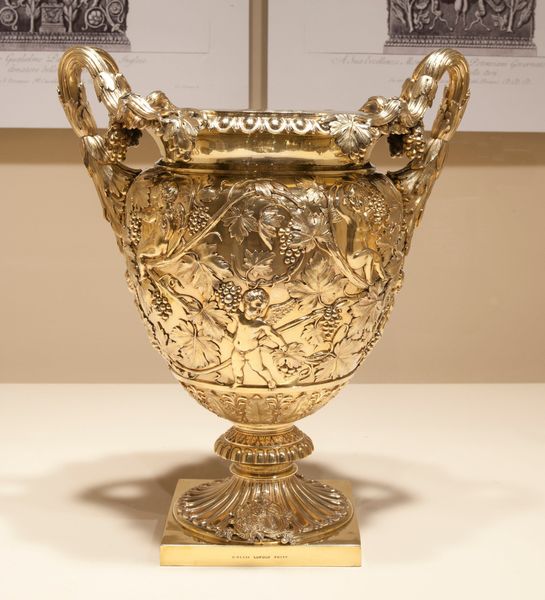 Editor: This is a silver wine cooler, made in 1828 by Edward, Edward, James, and Barnard. It’s incredibly ornate! The detailing with the leaves, grapes, and figures really strikes me. What layers can you peel back from this shiny object? Curator: Well, its very shininess is the first thing that strikes me. In the context of its time, such opulence speaks volumes. How does a piece like this reflect the social inequalities inherent in its commission and ownership? Who had access to such luxury? Editor: That's a great question. The wealth disparity back then must have been staggering. So, beyond the economic statement, does the imagery tell us anything? Curator: Absolutely. Think about the Neoclassical style— the celebration of Greco-Roman ideals. This era frequently sanitized the realities of ancient cultures, masking the pervasive slavery and social hierarchies. The wine cooler, adorned with bacchanalian imagery, seems almost a nostalgic yearning for a world built on exploitation. Who did it exclude? Who benefitted from this excess? Editor: I see what you mean. It's not just about appreciating its aesthetic beauty but also about critically examining the system that enabled its creation. So even a “simple” wine cooler becomes an artefact filled with questions and ethical considerations. Curator: Exactly. And thinking about the contemporary relevance, does conspicuous consumption persist today? How do luxury items reflect power structures in our current global context? Editor: That’s so interesting. I’ll never look at silverware the same way again! Thank you! Curator: And thank you. Hopefully, we've shown how art, even the most seemingly decorative, can be a lens through which we examine larger social and political questions.