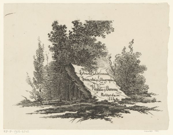 Curator: This is a drawing titled "Graf van Johannes Bernardus van Bree" by Wilhelmus Joannes Walter, dating from 1857-1894. It's currently held in the Rijksmuseum collection. Editor: A rather somber piece. The weeping willow immediately strikes me, its fronds cascading downwards, mirroring the gravity of the subject. What materials did the artist employ? Curator: The work primarily uses ink and pencil, resulting in subtle tonal variations that render a delicate, almost ethereal quality. It exemplifies the romantic style, wouldn’t you agree? Editor: Indeed. Consider the textured applications of ink creating the shadows, or how the layering of pencil generates depth to enhance the monument and background features. Curator: I find it quite poignant how the artist utilizes the weeping willow to visually connect the earth and the headstone, as a solemn link of the corporeal and what lies beyond. Editor: Definitely. It looks to be crafted by hand. Is there any historical documentation about where the paper originated? That might give some insight into Dutch Romantic-era consumption. Curator: That could prove useful for determining Walter's intentions within the drawing. I will be sure to make note of that when reviewing materials from the period. Editor: The material's journey from plant fibers to a canvas reflects not only Walter's creative act, but also a confluence of global exchange that informs the cultural landscape of the time. Curator: A valuable angle of thought. Thank you for helping consider an approach to enrich further scholarly readings of the piece. Editor: Certainly, the piece's creation becomes more relevant as the layers of history enrich and illuminate its design.