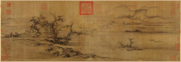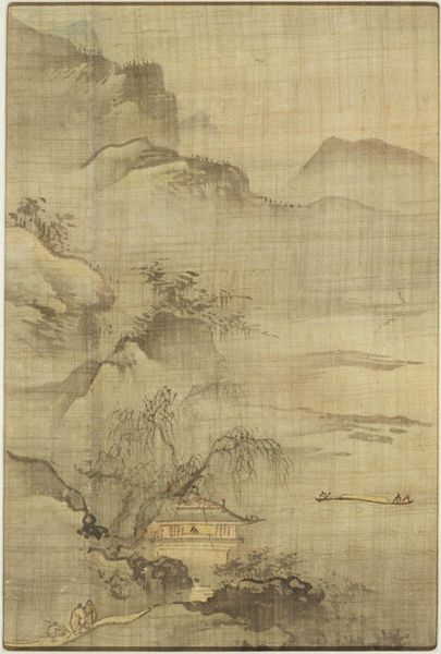 Editor: This is "Meeting Along the River," an ink painting made by Zhu Duan sometime between 1492 and 1518. I find it very calming, the muted tones create a sense of tranquility and spaciousness. What stands out to you? Curator: I'm immediately struck by the figures sparsely placed within the landscape, and the implied narrative suggests both travel and contemplation. Notice how small they are in relation to the mountains. The artist is evoking the Taoist principle of humanity's humble place within a vast universe. How does that reading affect your sense of its tranquility? Editor: That makes me think about how temporary and fleeting life can be, compared to these monumental, timeless mountains! Curator: Exactly. Consider the waterfall cascading down the mountain; water is symbolic of constant renewal and the passage of time, echoing that feeling of human impermanence. Is that something you see reflected elsewhere in this painting? Editor: I think the winding river also symbolizes the passage of time, doesn't it? It’s almost like a visual metaphor for life's journey, with all its twists and turns. Curator: Precisely! And look closer still, what does the artist suggest about nature versus the human world? Editor: The buildings seem intentionally placed to blend in, and it reinforces the feeling of balance with nature. Before, I just saw it as a nice landscape painting, but now I see it’s filled with all these embedded ideas! Curator: These symbols build up meaning and reveal lasting values! Now consider the visual language, too, in relation to its message. That, perhaps, is for another visit.