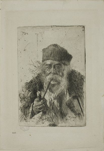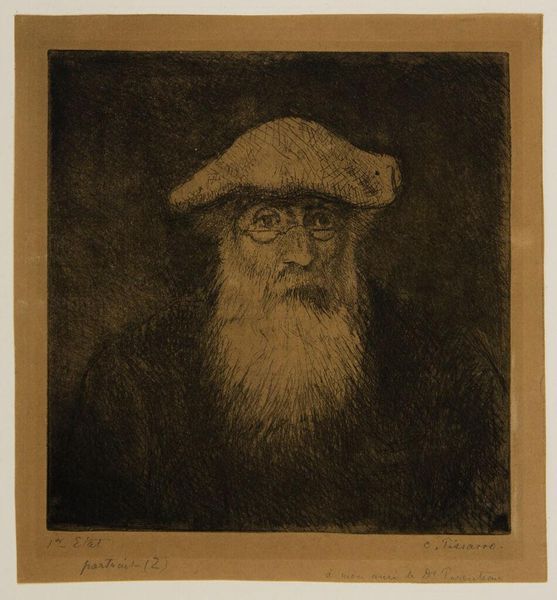 Curator: Here we have Camille Pissarro’s self-portrait from around 1890, currently held in the collection of the Art Institute of Chicago. It’s an etching, printed on paper. What's your initial take? Editor: Striking, almost somber. The heavy use of dark lines creates a deeply textured surface, drawing me into the gravity of his expression. It looks like he is assessing us carefully. Curator: Absolutely. We can contextualize this within the late 19th-century art world, where artists began exploring their inner selves, challenging the academic focus on grand historical narratives. The very act of a self-portrait is inherently a statement of identity, pushing against established hierarchies. Pissarro, particularly as a Jewish man in France, navigates a complex landscape. Editor: That context really adds layers to the materiality. An etching demands meticulous labor. Think about the process, the acid biting into the metal, each line a conscious act of production. There’s no quick sketch here; this is deliberate, considered craftsmanship. Curator: And that craft reinforces his presence! Pissarro wasn't just rendering a likeness; he was constructing a persona. He presents himself with a direct gaze and what looks like traditional headwear. How do we interpret his aesthetic choices as an older man, positioning himself within contemporary social discourse? Editor: It speaks to control, even defiance, given the Impressionist rejection of the Salon system. He's literally making his own mark, from conception to physical print, bypassing traditional routes of artistic validation. Consider the scale too - it suggests intimacy, like holding a personal thought in your hands. Curator: I think your insights on materiality provide such nuance to the socio-political readings here. What is particularly potent is how Pissarro grapples with portraying both the individual and the artistic figure simultaneously through a conscious labor. Editor: The tension is compelling. By controlling the means of production and the artistic outcome, Pissarro seems to command how his story is crafted. A potent act for someone always dedicated to portraying social realities around him, isn't it? Curator: Indeed. Thinking about Pissarro's artistic choices here enriches our grasp of how Impressionism functioned within the context of his life and contemporary discussions of selfhood. Editor: I agree completely. Reflecting on Pissarro’s method really shifts our understanding beyond simple aesthetics toward deeper artistic declarations.