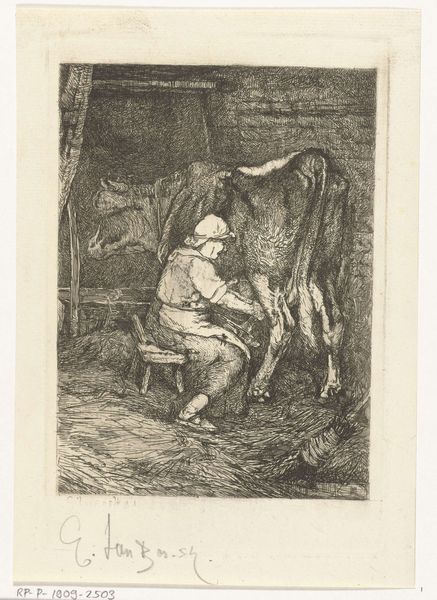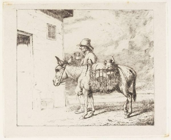 Curator: What do you make of this Millet? "Peasant with a Wheelbarrow," as it's known. The way the light falls is exquisite. Editor: Stark. A heavy feeling permeates it. The figure seems burdened, not just by the wheelbarrow. Curator: Indeed. Millet, who lived from 1814 to 1875, was known for his representations of rural life. Notice the meticulous etching, the contrast between the figure and the dilapidated structure. Editor: Yes, there’s a political element here. Millet is highlighting the difficult lives of the peasantry, giving dignity to labor that was often overlooked. Curator: The composition draws the eye directly to the peasant, central and stoic, almost monumental despite his humble task. Editor: It's a powerful statement about the value of work and the human condition. He elevates the peasant to a figure of importance. Curator: A study in form and content, beautifully articulated. Editor: It makes you think about the dignity inherent in all work, even the most unseen and unglamorous.