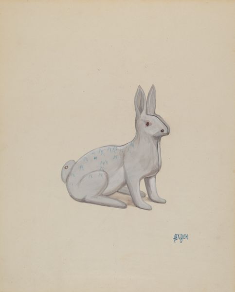 Curator: Take a moment to observe "Garden Figure (Rabbit)," a pencil and charcoal drawing created around 1939 by Maurice Van Felix. It possesses a quiet, contemplative quality. Editor: It certainly does. The monochromatic rendering gives the subject a humble, almost utilitarian appearance, despite the cuteness often associated with rabbits. It also feels a bit mournful. Curator: Van Felix's choice of such accessible materials --pencil and charcoal-- invites reflection on art's role during a period marked by both economic hardship and burgeoning consumerism. What could be luxurious and mundane at once? Editor: I find the very use of such common materials telling. It speaks volumes about the means of artistic production being as essential to understand as the finished work. A mass-produced object rendered in simple, earthy media questions the hierarchy of high art and humble craft. Curator: That's precisely the tension Van Felix seems to evoke, perhaps highlighting class distinctions inherent even within representations of nature. How do representations of the pastoral idyll change during times of conflict or poverty? This garden ornament drawn in charcoal hints at that wider intersection. Editor: And those shadows are so dense and the material seems almost to swallow the rabbit's form. It's interesting to think about how such an ordinary garden object—likely factory-made—is meticulously recreated by hand, perhaps suggesting a re-evaluation of value through labor and the means of artistic production. Curator: The rabbit becomes a lens through which we can investigate the artist's position in society during those challenging times, a kind of silent witness to cultural anxieties and artistic production during a specific socio-political climate. What statement might its artist be attempting through the drawing process? Editor: Ultimately, seeing this garden ornament translated through accessible drawing materials, it compels us to acknowledge the significance of humble methods and mass-produced objects as subjects worthy of artistic exploration. Curator: An invitation to ponder how material considerations inevitably influence an artist's social and cultural commentary.