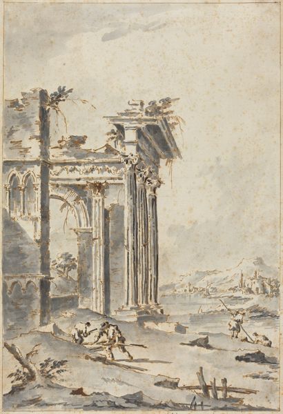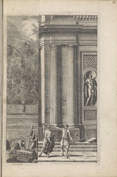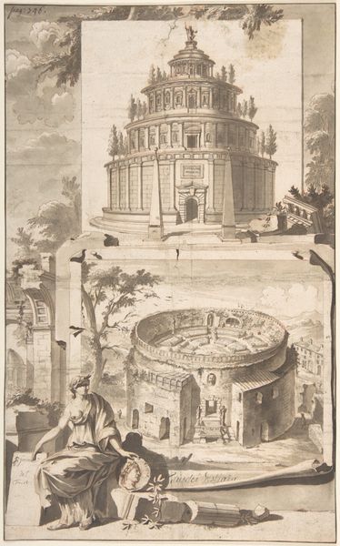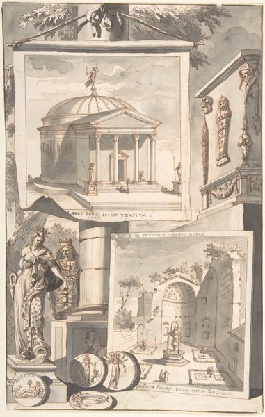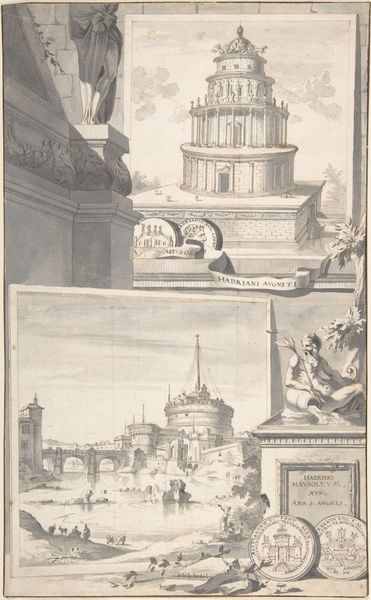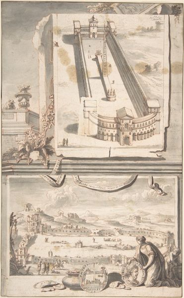 Curator: This is Jan Goeree's "A Reconstruction of the Temple of Divus Claudius in Monte Coelio (above) and a View of the Ruins (below)," dating roughly from 1690 to 1704. The piece combines drawing, etching, and engraving using ink. Editor: It evokes a melancholic atmosphere, a delicate dance between grandeur and decay. The monochrome palette enhances this feeling, creating a contemplative space. Curator: Indeed. Look at the contrast Goeree presents. The upper panel meticulously reconstructs the temple in its idealized form, a testament to classical architecture's enduring allure and human ingenuity. Editor: And the panel below shows us the real world, the temple as ruin, subject to the passage of time and the inevitable erosion of materials. The symbolic weight of that contrast—ambition versus reality—is compelling. What about the people populating these spaces? Curator: Ah, their presence gives the drawings scale, but it also underscores the Temple’s function. We see a lively public space becoming, in its ruined state, a sort of picturesque landscape. Their labor, the very act of building, has been superseded by commerce or leisure. Editor: I see them more as guardians or ghosts inhabiting sacred grounds. Consider that coin bearing a profile inserted to the right; such artifacts ground this in an intimate past, but are themselves, ironically, enduring symbols, perhaps more lasting than the physical structures they portray. Curator: That’s an interesting interpretation, focusing on individual tokens amidst collective ruin. To me, though, the emphasis is on the tangible traces left behind. How do we rebuild or, even, simply, accurately recall past endeavors? Goeree points to the partial survival of the physical structure as evidence. Editor: But the reconstructed Temple is not purely objective either, is it? The artistic rendering becomes a symbolic assertion, a commentary on cultural memory and our persistent attempts to restore what has been lost through destruction and historical circumstance. Curator: I agree that memory plays a crucial role, even as the material remnants dictate the form of the ideal. Perhaps it is the enduring artistic reproduction that conveys true historical import. Editor: Ultimately, it's that push and pull between material degradation and symbolic endurance that really grabs my attention. Curator: Yes, a constant negotiation we've been revisiting this entire time.