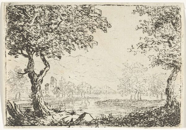 Editor: Here we have "Landscape with Shepherd and Sheep" created between 1637 and 1679 by Philips Augustijn Immenraet, currently residing here at the Rijksmuseum. It's an etching and, right away, I notice the light. There's such delicate detail with the sky. What compositional choices stand out to you? Curator: Observe the arrangement of forms: the large tree on the right, the flock of sheep and the tiny figure of the shepherd placed lower and closer, offset by the distant church and sky. How does this structure lead your eye across the image? Editor: It does create a flow...almost a circular movement starting with the dark, denser area and up toward the light clouds. The placement of that shepherd really emphasizes the landscape. Why make him so small, almost an afterthought? Curator: Consider how scale and relative proportions within the composition impact the pictorial balance. The artist guides our vision using contrasts—light and shadow, density and sparsity. What visual evidence suggests this is a meditation on space itself? Editor: So, not just about sheep, trees, and churches? The depth created by varying the hatching? Curator: Exactly. Notice how the artist uses subtle gradations to generate a feeling of depth and to invite contemplation. Are we observing or participating? Are we within this pictorial space, or simply apart from it? Editor: That's a great question! I’m so used to thinking about the "meaning" of the shepherd, I didn't even really consider how the marks and lines create a sense of spatial depth...thank you. Curator: A fruitful investigation.
