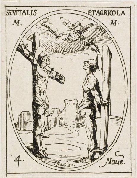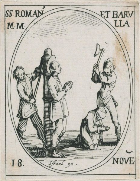 Editor: This is Jacques Callot's "Saint Cyracus," an etching, made sometime in the early 17th century. It's rather small, and the stark lines create a chilling effect. What compositional elements stand out to you? Curator: The formal construction is quite compelling. Note the oval frame and the contrasted diagonals of the figures. The cross-hatching, while simple, skillfully conveys depth and texture. How does the dynamism affect your reading of the work? Editor: It amplifies the violence, though at a distance. The figures almost appear like stage actors. I wonder about the significance of the oval frame. Curator: It serves to isolate the scene, enhancing its intensity by focusing solely on form. Consider how Callot's meticulous technique impacts the overall reading. Editor: It's amazing how much detail is conveyed in such a small space! I never considered the frame as part of the composition, rather than just a border. Curator: Precisely. Close analysis reveals how each element contributes to the totality of the artwork's impact.