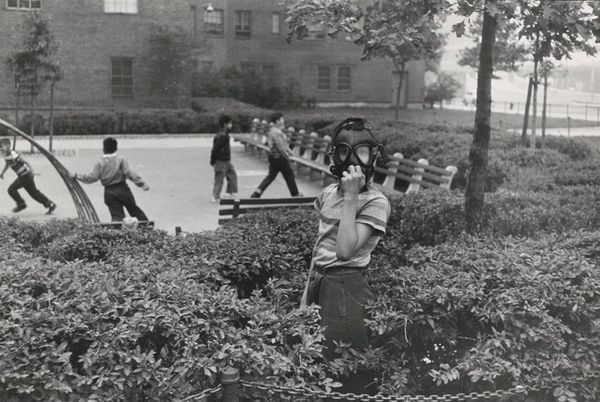 Editor: So here we have Gordon Parks' "Boys with Raised Baseball Mitts, Chicago," from 1953, a gelatin-silver print. What strikes me most is the dynamic energy, contrasting with the rather gritty, urban backdrop. What do you see in this piece? Curator: The initial formal reading draws attention to the geometry created. Parks juxtaposes the spontaneous, upward thrust of the boys against the rigid, horizontal lines of the architecture. The puddle introduces a doubling, a visual rhyme that enhances the composition. Notice also the tonal range. Editor: Yes, the reflections in the puddle almost create an inverted world. It’s fascinating. Why emphasize these structural elements? Curator: Structure is the armature upon which the entire aesthetic experience rests. Parks employs contrast--between light and shadow, movement and stasis--to generate visual interest, guiding the eye throughout the composition. Semiotically, these structures are signifiers, cues to interpretation. Ask yourself what might those contrasting elements mean to the viewer? Editor: I guess it makes me think about the energy of youth against this…dour backdrop. The ephemeral moment, caught forever. Is it too much to read that in? Curator: No, I think you are onto something, the elements converge beautifully. I find I’m thinking about light and shadow, how it catches fleeting movements with lasting form. Editor: So interesting; thanks for sharing a completely different reading of the work. Curator: It has been my pleasure. Examining Parks’ strategy has given me new eyes to understand the piece more deeply.