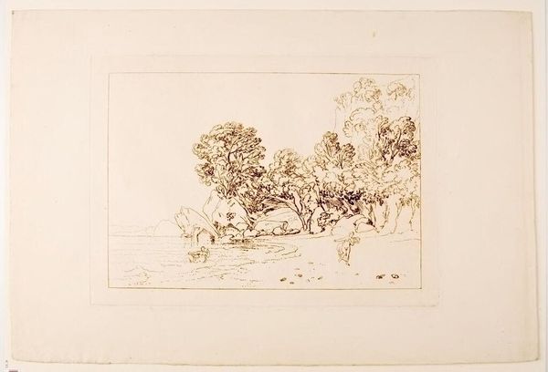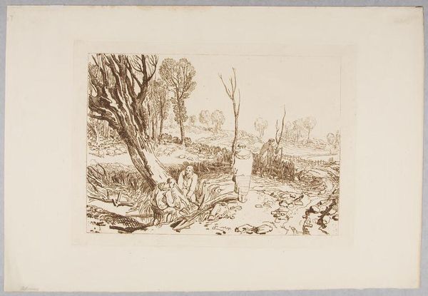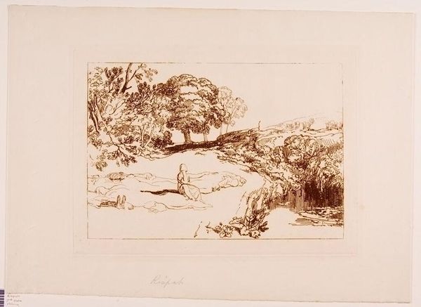 Editor: This is "Rispah" by Thomas Goff Lupton, an etching in brown ink. It has a sort of mournful, desolate atmosphere. What can you tell me about the composition? Curator: Note how the stark linearity of the etching defines space. The contrast between the dense foliage and the open sky directs our gaze. The figure's placement at the center serves as a focal point, yes? Editor: It does. The way the lines sort of vibrate with texture is interesting too. I see the light and shadow. Curator: Observe how the artist uses line weight to articulate form. The varying densities of the etching create depth and volume within the composition. Editor: I see. So the meaning is rooted in the technique itself. Thank you. Curator: Precisely. Technique informs the interpretation. A rewarding analysis, indeed.