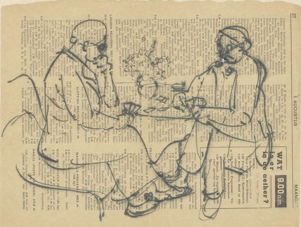 Henk Henriët's drawing, "Werklieden bij een afsluiter" at the Rijksmuseum presents two workers rendered with a stark, economic use of line, primarily in graphite on paper. The composition is structured around the human figures and architectural elements that suggest a landscape, yet the texture of the drawing remains raw, almost unfinished. This rawness evokes a sense of immediacy and perhaps even a quietude. Henriët's strategic use of line is critical. The hatching creates volume and shadow, particularly on the workers’ clothing. The composition reflects a concern with the working class – the figures are centralized, but the scene remains austere, devoid of ornamentation. Henriët seems less concerned with idealizing his subjects than with rendering them in a manner that matches their labor: straightforward, unadorned, and essential. Through the formal qualities of this drawing, Henriët gives dignity to the subjects, underlining the importance of human labor. The visual language here communicates not just what is seen, but the very act of seeing itself.