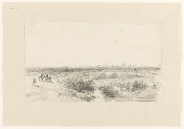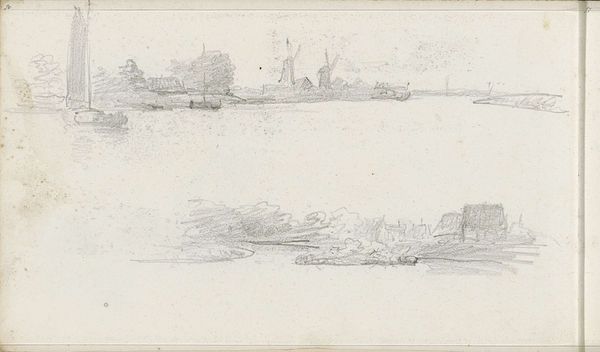Gerrit Postma created this drawing of a Dutch landscape with graphite on paper. The subdued monochromatic palette creates a harmonious composition. Postma masterfully uses line and shading to define forms, from the distant hills to the coastal details. The composition is cleverly divided into two parts, both horizontally, with the landscape in the top half, and vertically with the town on the left and the ship on the right. The buildings with precise details, like the sails, anchors the viewer's gaze, contrasting with the more diffuse rendering of the sky. The structural arrangement invites a semiotic reading, with the land representing the stability of human settlement and the ship embodying exploration and change. Through subtle contrasts in texture and tone, Postma prompts us to consider the interplay between permanence and movement, structure and fluidity, in our interpretation of the landscape.