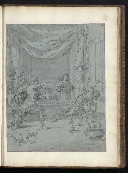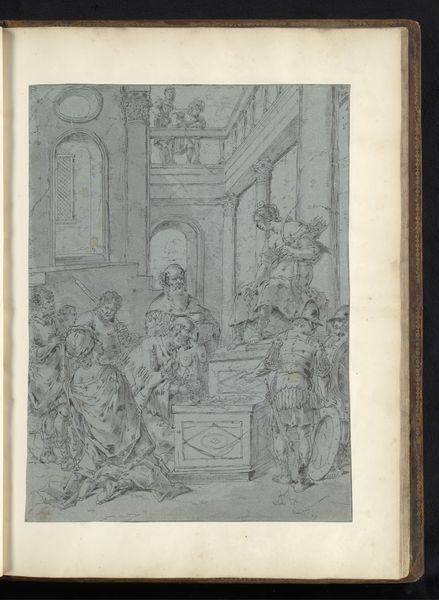 Curator: Before us we have Leonaert Bramer's rendering of Alexander the Great's legendary feat: cutting the Gordian Knot. Bramer executed this Baroque scene in ink, likely between 1655 and 1665. Editor: My first impression is how surprisingly light it feels! The linework is delicate, almost airy. And while the subject suggests grand, historical drama, the artist conveys a restrained kind of power, wouldn't you agree? Curator: Restraint is key here. Bramer prioritizes structure. Notice how the composition leads the eye: the linear perspective of the architecture, converging toward the background. And how the tension between the stasis of the statues versus the action of Alexander and his entourage charges the scene. The figures are deliberately arranged for optimal visual balance. Editor: Symbolically, the knot itself is the main event! Legend has it that whoever could untie it would rule Asia. Alexander, impatient with diplomacy and destiny's slow pace, simply sliced through it with his sword. The act embodies decisive leadership but also potentially, rashness. What do you think Bramer might be suggesting? Curator: It is hard to say, though he would have been working from established tropes. Given the Baroque sensibilities, and the inherent tension in the composition, perhaps we are meant to consider it a metaphor for forceful innovation, cutting through old, complicated conventions for a new order. Observe, though, the curious figure to Alexander's left: an almost spectral onlooker gazing knowingly upon the beheading of the Gordian Knot. What might they know about all this? Editor: Perhaps a recognition of destiny's unfolding. This character echoes the psychological weight behind this kind of mythological subject. It touches on how these moments resonate across cultural memory. What once was, becomes myth, becomes instruction. Curator: And from an artist in the mid-17th Century, the myth becomes technique. In Bramer’s rendering, you see the foundation for future draughtsmen: composition as narrative force, in and of itself. Editor: A fascinating encounter, indeed. The scene encapsulates the weight of leadership, all brought to life with deftness. Curator: Absolutely. Bramer certainly leaves much for us to unpack here about the formal construction of meaning.