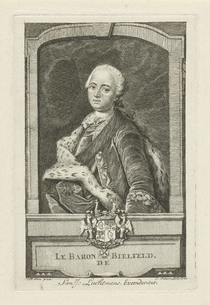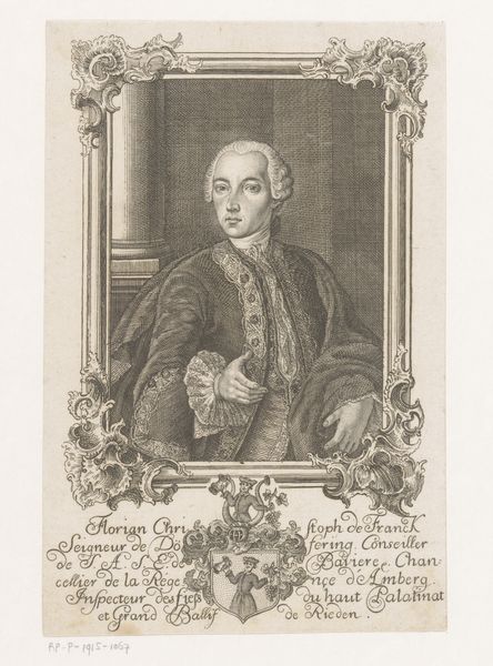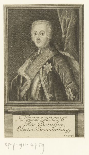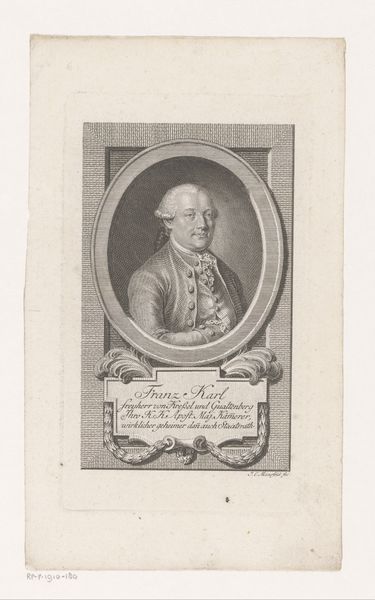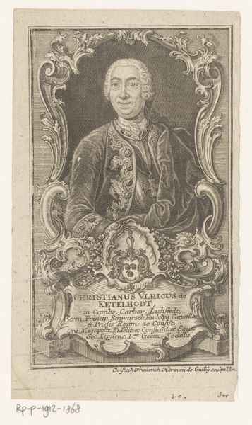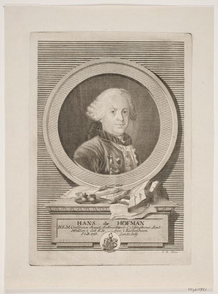 Curator: Before us we have "Portret van Friedrich Heinrich Carl van Pruisen," an engraving crafted by Johann David Schleuen, dating from around 1721 to 1771. It currently resides here at the Rijksmuseum. Editor: There’s an immediate formality, even stiffness to this image, isn’t there? The stark lines of the engraving, the subject's rigid profile. It speaks to a very particular era and societal structure. Curator: The lines created in this Baroque portrait certainly give that effect; note the intricacy in Schleuen's technique. Look closely at the meticulous cross-hatching, which creates the subtle gradations of tone defining Prince Frederick’s face and attire. This wasn't merely representational; it was a demonstration of skill. Editor: Absolutely, the Prince is presented almost as an emblem. The laurels surrounding the inscription bearing his name and title are not just decorative, are they? Laurel wreaths throughout the ages have symbolized triumph and status. The frame motif around his likeness, with its sharp, classical lines, speaks of controlled authority and self-possession, as one might expect from Prussian aristocracy. Curator: Indeed, that ornate frame further separates and elevates the subject within. And that placement is enhanced further by the way light is handled: see how Schleuen manipulates illumination to define form and draw the eye directly to Prince Frederick’s features, accentuating the precision of line. Editor: I read something almost mournful here, beneath all of the formal presentation. Think about how printed images allowed people to remember or visualize people that might never see in person, and how these portraits may represent figures we only see printed or shared with other aristocrats. It preserves not just the man but also a certain idea of power—rigid, contained, perhaps already fading. Curator: Interesting to interpret the medium that way, for beyond representing the individual likeness, Schleuen demonstrates through skillful rendering that such techniques embody particular status hierarchies—social rank solidified through line and form. Editor: Ultimately, seeing him rendered through this engraved medium evokes a palpable sense of temporal distance, even melancholy, especially compared to contemporary artistic practices. Curator: Precisely, such visual structures also allow insight into cultural value through the work's intrinsic visual rhetoric; indeed a portrait as an object in its own time.