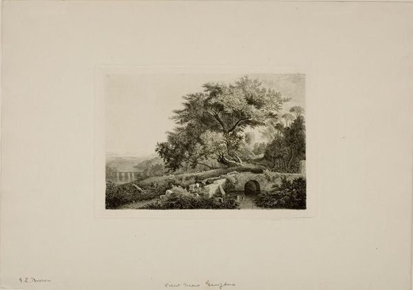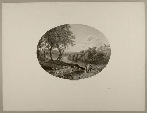 Curator: Here we have "The Sun's Effect" by Marie Alexandre Duparc. What's your initial take? Editor: An aura of pastoral longing. The distant windmill and rising sun evoke cyclical themes of labor and hope. Curator: Note how Duparc organizes depth through tonal variation and controlled gradations, moving our eye through distinct visual planes. Editor: Absolutely, and the sun itself is a universal symbol, here perhaps representing enlightenment or the divine order of nature. The villagers seem at peace under its gaze. Curator: Do you find that the detailed foreground clashes with the smoothness of the distant sky? Editor: Not at all. The contrast underscores the connection between the earthly and the celestial realms. It invites contemplation on the human place within a larger cosmic picture. Curator: An interesting interpretation, colored by symbolism. Editor: It's how we make sense of our world, isn't it? Curator: Indeed. A lovely meditation, whatever the method.